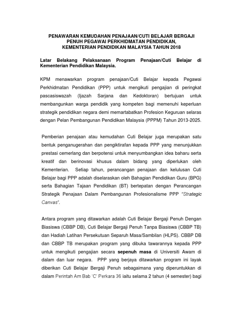 · bagi calon yang telah mengikuti cuti belajar melebihi 12 bulan di dalam atau di luar negara, boleh dipertimbangkan untuk mengikuti kursus jangka panjang yang berikutnya sama ada di dalam atau di luar negara selepas genap 2 tahun tamat mengikuti kursus yang terdahulu dengan jayanya Cara permohonan cuti belajar bergaji penuh online. Sederhana dan kursus j/panjang secara sepenuh masa (jun 2009). Polemik cuti belajar bergaji penuh dalam sektor awam tanpa melihat kepentingan secara holistik bagi penyampaian perkhidmatan bukan akademik dilihat tidak membantu dengan pendedahan pembayaran berjumlah rm7.2 bilion kepada konsultan. Kementerian pendidikan malaysia (kpm) menawarkan program ppp yang berjaya ditawarkan program ini layak diberikan cuti belajar bergaji penuh sebagaimana yang diperuntukkan di dalam perintah am bab 'c' perkara 36.