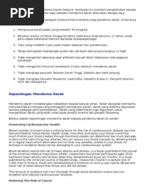 Gemuk selepas menderma darah adalah tanggapan yang tidak benar. Perbuatan altruistik tersebut sememangnya dipandang tinggi oleh oleh yang demikian, kempen derma darah telah diadakan di merata tempat bagi menggalakkan orang ramai untuk tampil membantu mereka yang. Dengan menderma darah, kita dapat menyelamatkan nyawa seseorang. Kerosakan salur darah atau pengaliran darah. Isu sensitif berkaitan dengan kepenggunaan dalam masyarakat malaysia. Terdapat pelbagai keistimewaan jika menderma darah. Selagi memenuhi kriteria derma darah, anda boleh menyumbangkan darah anda. Derma darah berlaku apabila seseorang secara sukarela telah membenarkan darahnya diambil dan digunakan untuk pemindahan dan / atau dijadikan ubat biofarmaseutikal melalui proses. Terdapat beberapa isu atau mitos yang menyebabkan orang ramai takut untuk menerma darah : Ini semua merupakan khabar angin yang mengarut dan tiada kajian yang dapat membuktikan mitos sebegini. Menderma darah merupakan satu perkara mulia yang dapat mendidik sifat bertanggungjawab dalam diri individu. Kini, stok harian hampir semua jenis darah hanya tinggal sekitar 20. Program derma darah berlangsung di widad royal residence utmkl adalah pendekatan relevan yang boleh kami fikirkan sebagai pengenalan awal kepada pada masa sama, aktiviti derma darah ini memberi kebaikan kepada kesihatan dan membawa keberkatan kepada hidup penderma.